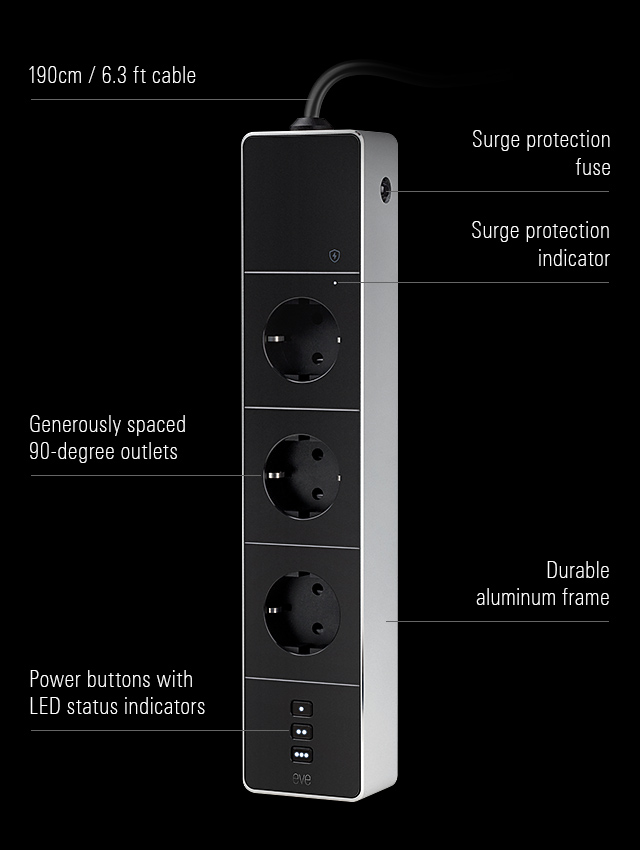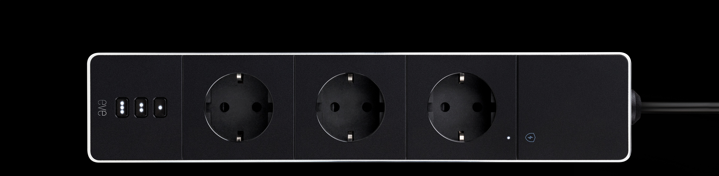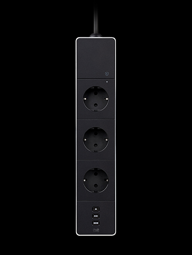 Flaunting a matte black chassis enveloped by a rock-solid aluminum frame. Complete with a durable 190 cm / 6.3 ft cable. Generously spaced 90-degree outlets. And manual controls sporting white LED power status indicators. Eve Energy Strip is built to impress, and slot seamlessly into your connected ecosystem.