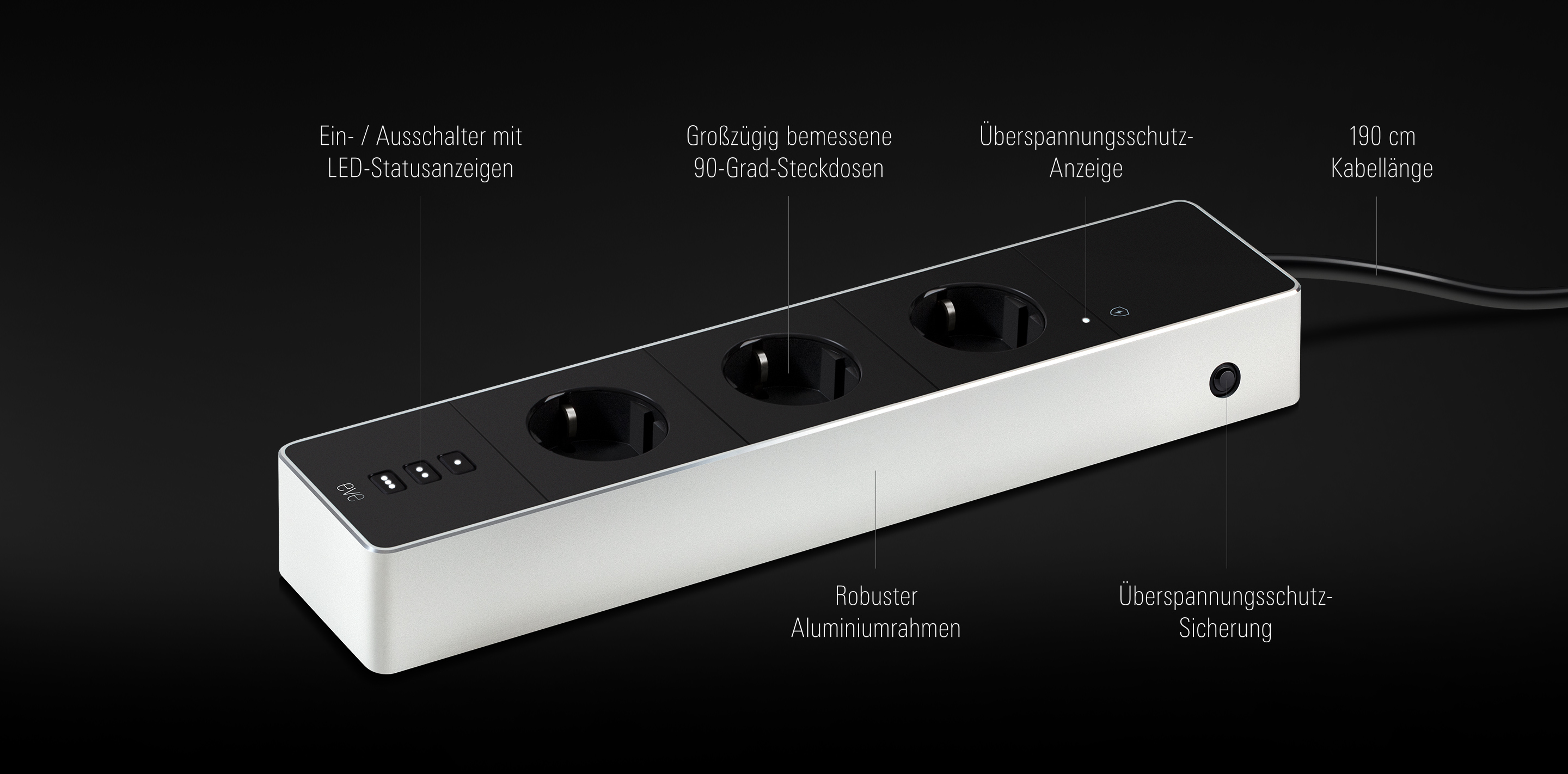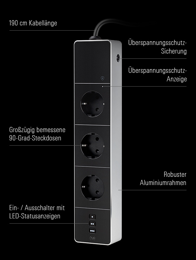 Stilsicher mit mattschwarzem Gehäuse und einem robusten Aluminiumrahmen. Ausgestattet mit einem strapazierfähigen Kabel (190 cm). Großzügig bemessene 90-Grad-Steckdosen. Und Bedienelemente mit weißen LED-Statusanzeigen. Eve Energy Strip überzeugt mit elegantem Design und fügt sich nahtlos in deine bestehende Smart-Home-Umgebung ein.