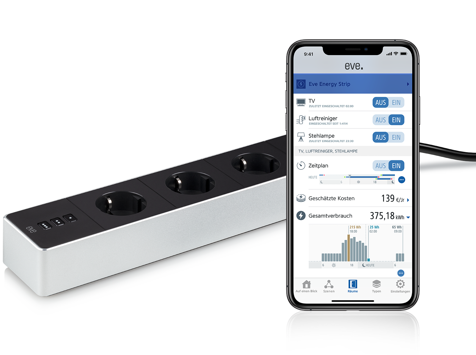 Mit Eve Energy Strip steuerst du drei Steckdosen unabhängig voneinander per App oder Siri. Passe Beleuchtung und Alltagsgeräte deinem Tagesrhythmus an. Schütze deine wertvolle Elektronik vor Überspannung und mehr, und behalte ihren Stromverbrauch im Blick.
