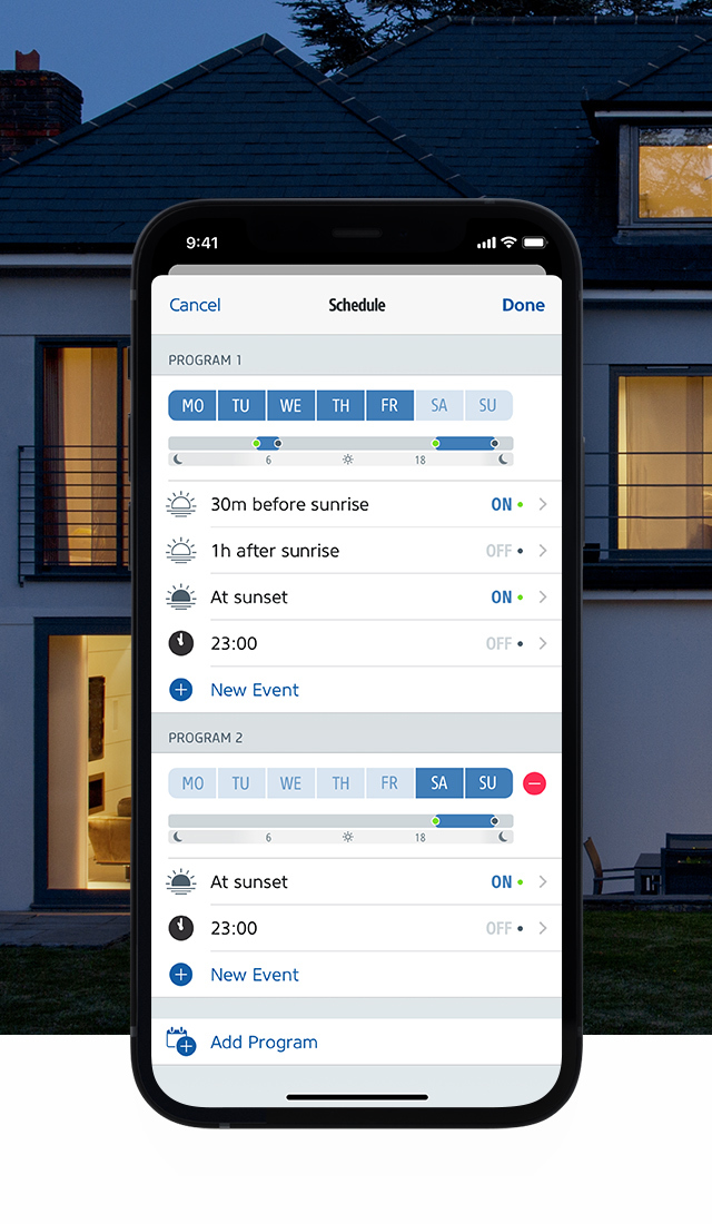 Schedules enable you to put your lights on autopilot. Add schedules for workdays and the weekend to suit your routine, or have your lights turn on at sunset even if you’re not at home – that’s not only convenient, but also reassuring. And as all schedules are stored right on Eve Light Switch, your lights will switch on and off independently of any phone, hub, or internet connection.