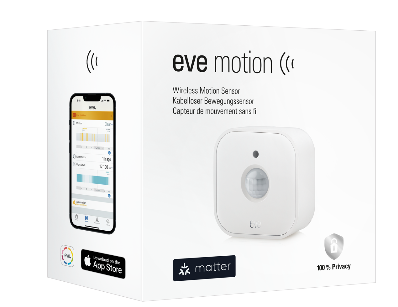 Eve Motion has a 120-degree field of view spanning 9 meters of range, giving you plenty of room to play with. And the wireless operation permits total freedom of placement.