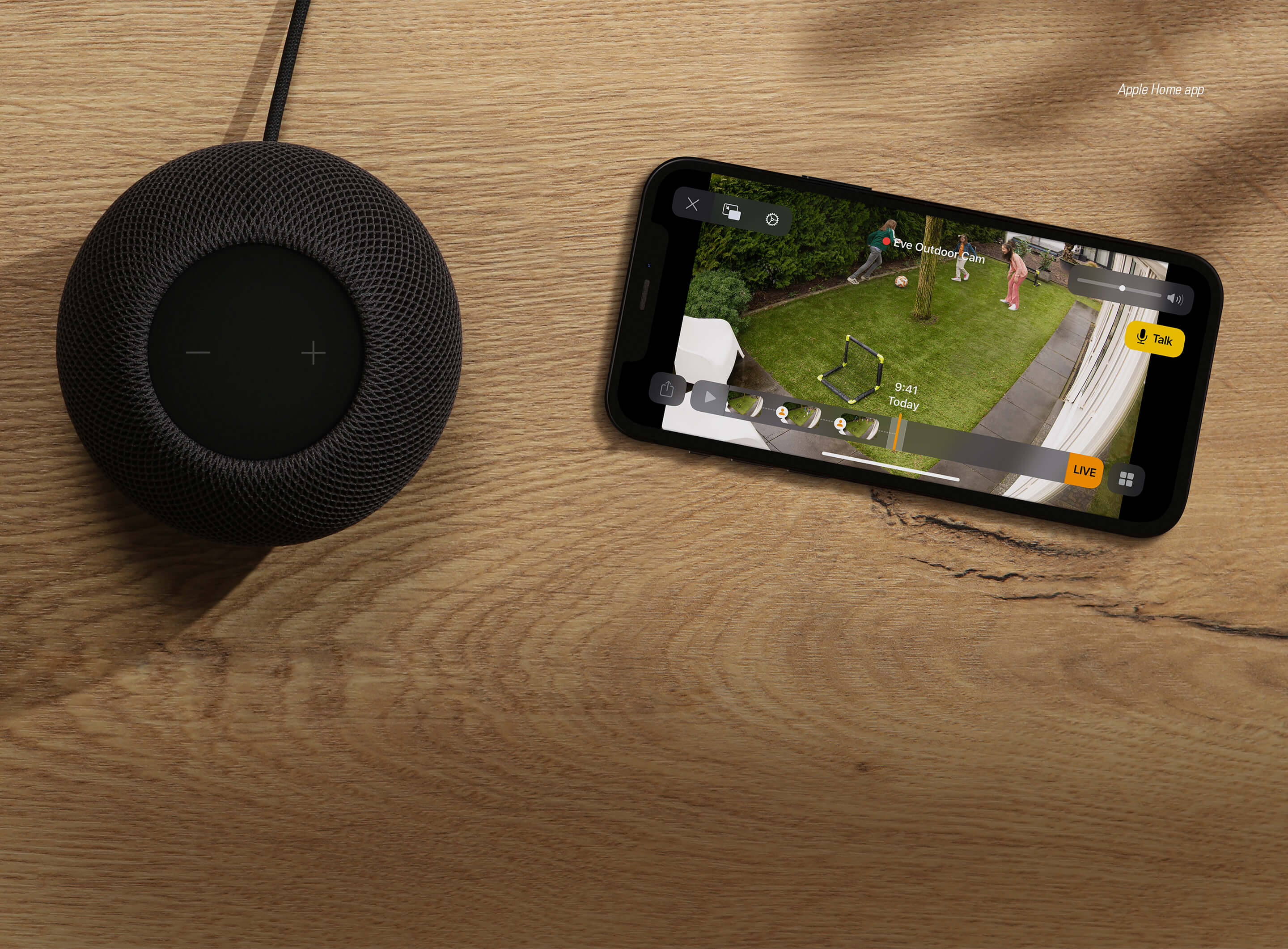 When you view the video stream from your Eve Outdoor Cam while out and about, you communicate back to base directly over an end-to-end encrypted connection. Your camera's live stream never reaches the cloud – not even the iCloud.