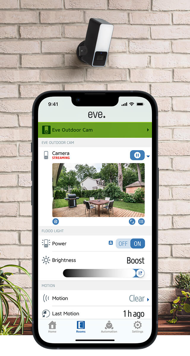 Eve Outdoor Cam integrates easily into your HomeKit ecosystem: Take your home security to the next level by having the accessory turn on other connected outdoor lights or light switches automatically when motion is detected.