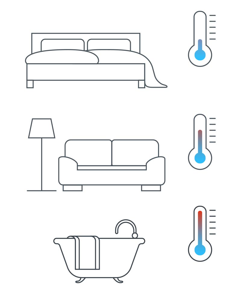 Set the perfect temperature in each room for your wellbeing and to get a good night’s sleep. Set your bedroom to 17 degrees, your lounge to 21 degrees, and have your bathroom warm up to 23 degrees ready for you in the morning.