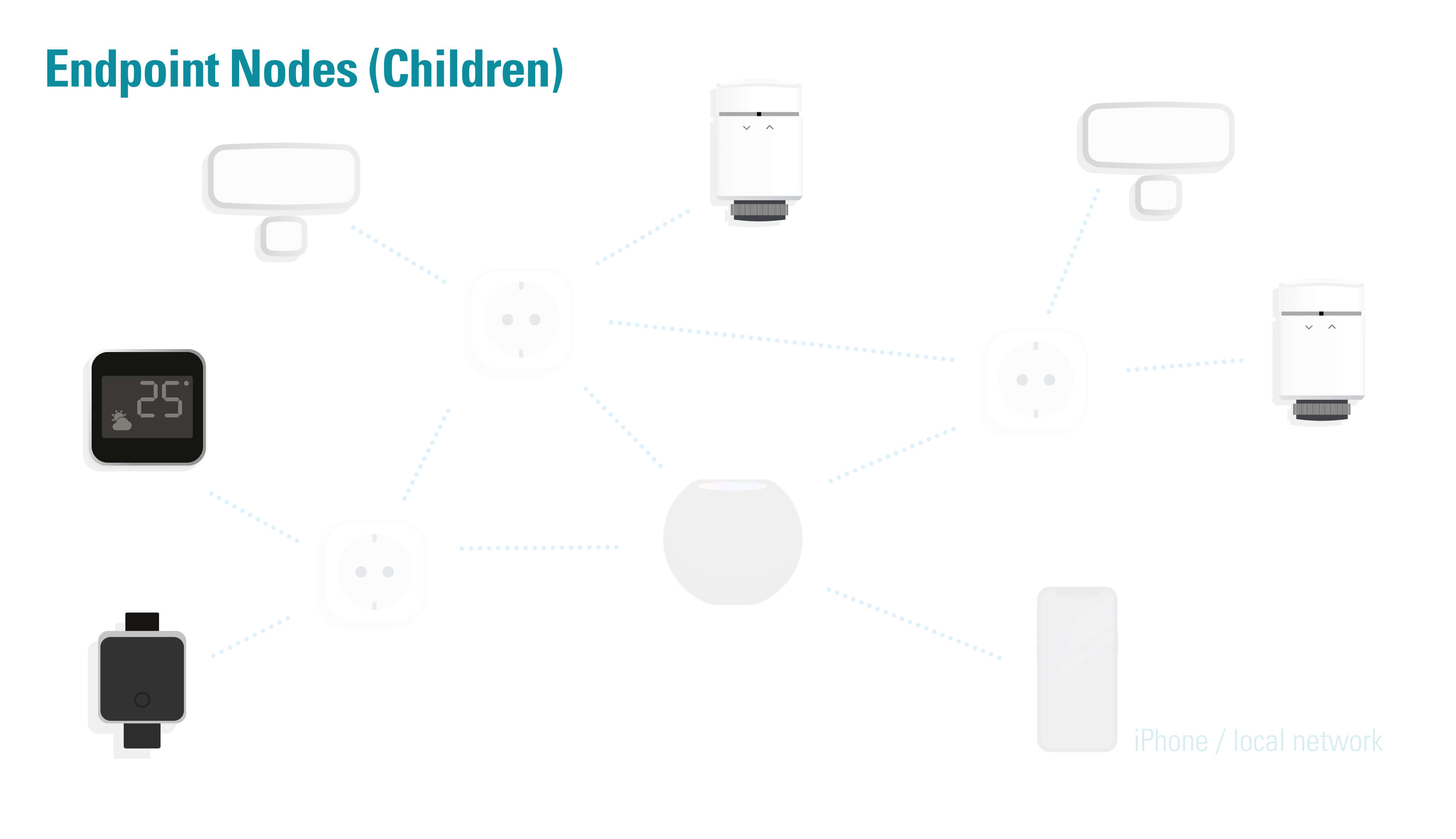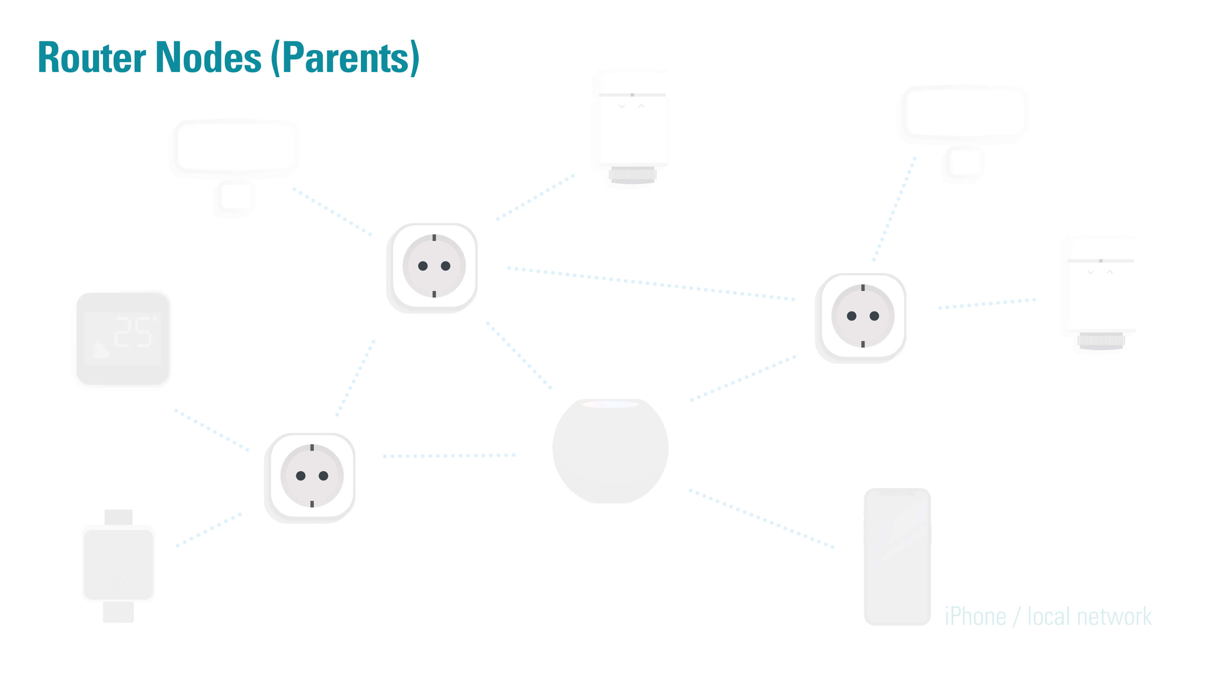 Sehen wir uns die Rollen einmal näher an. Router Nodes (Knotenpunkte) sollen Pakete mit Informationen im Netzwerk verteilen. Ein Router Node kann außerdem Endpunkte verwalten – dann ist der Router ein Parent. Mit Netzspannung versorgte Thread-Geräte wie Eve Energy eignen sich als Router in deinem Thread-Netzwerk und können Datenpakete weiterreichen.