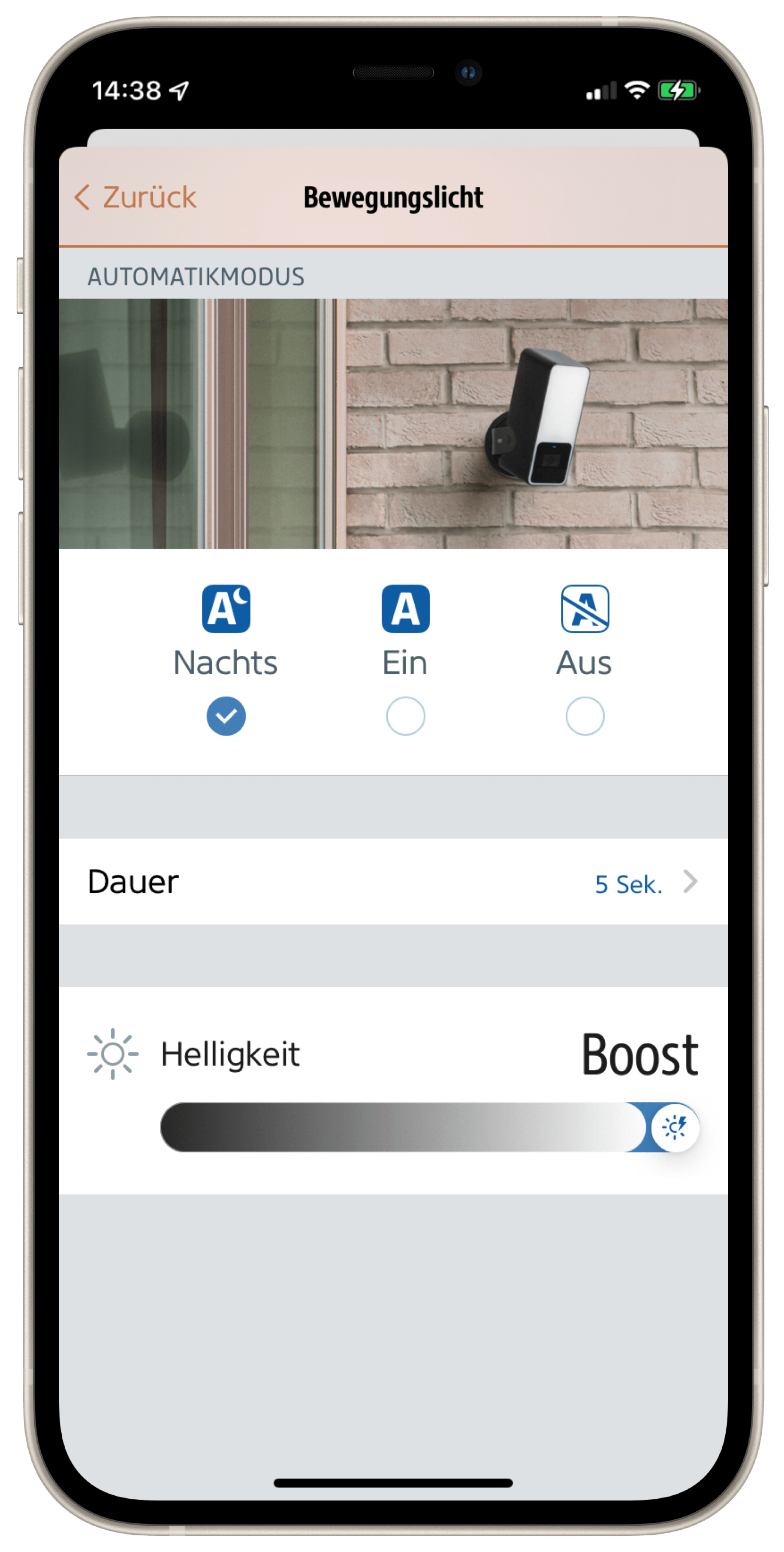 Wie empfindlich das Flutlicht reagieren soll, lässt sich in Eve > Einstellungen > Eve Outdoor Cam über die Einstellung des Bewegungssensors regeln, und wie grell es erstrahlen soll, legst du ebenfalls hier fest, in der Einstellung für das Bewegungslicht. Außerdem stellst du hier über die Option Automatikmodus ein, ob das Bewegungslicht durchgehend oder nur nachts – wenn der eingebaute Helligkeitssensor Dunkelheit meldet – anspringen soll. Wähle die Option Automatikmodus > Nachts, um den Umgebungslichtsensor einzubinden und das Sichtfeld nur bei Dunkelheit zu beleuchten. Über die Einstellung Dauer legst du fest, wie lang das Flutlicht nach erkannter Bewegung leuchten soll.