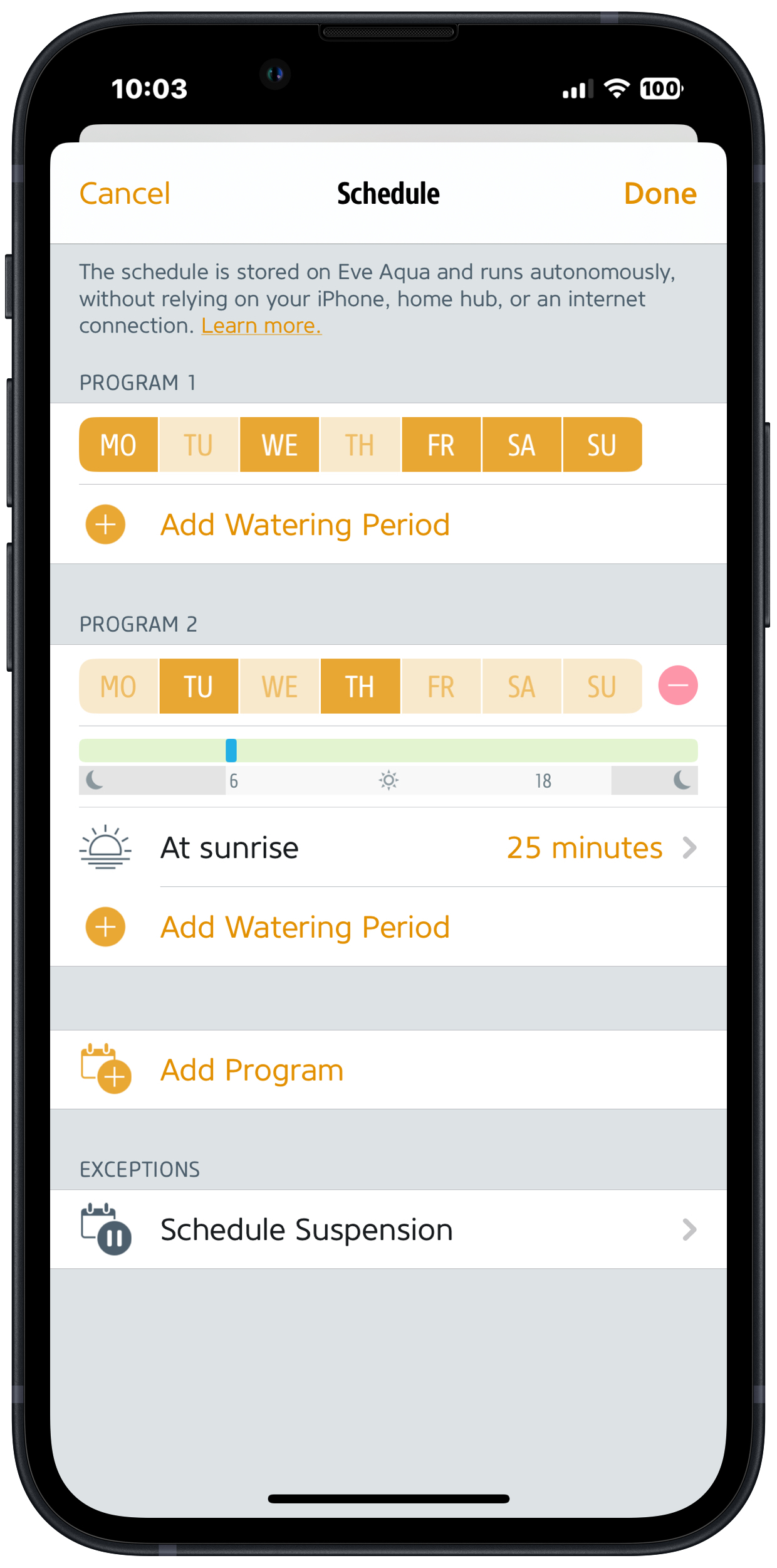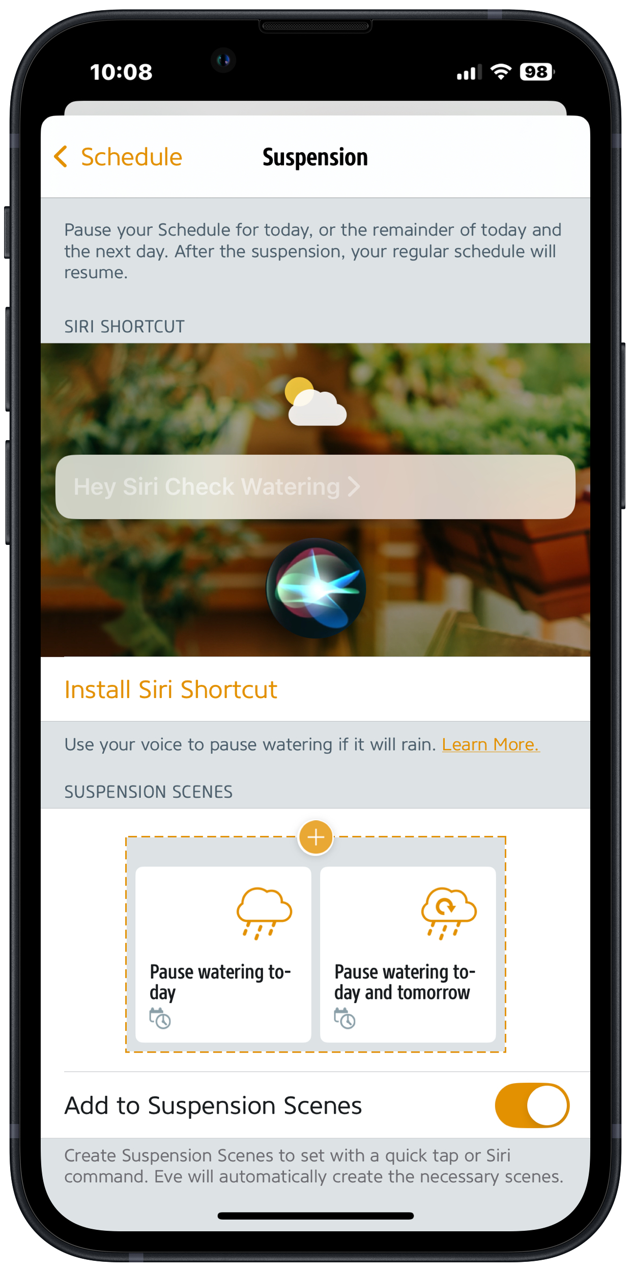 In conjunction with the Shortcuts app from Apple, the Eve app lets you suspend the watering schedules stored on your Eve Aqua if the weather is going to take a turn for the worse. All you need to do is to install the built-in shortcut right from within the Eve app.