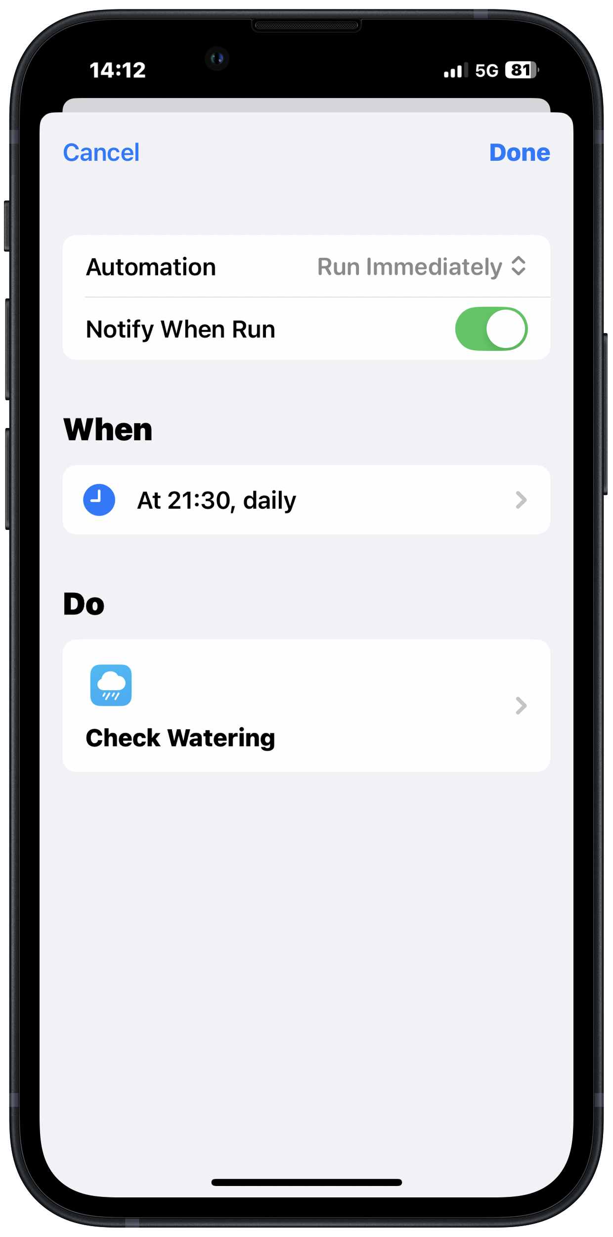 Take the sheer convenience to the next level by setting up an automation. It will run the check the "Check Watering" shortcut for you – one less thing to think about.