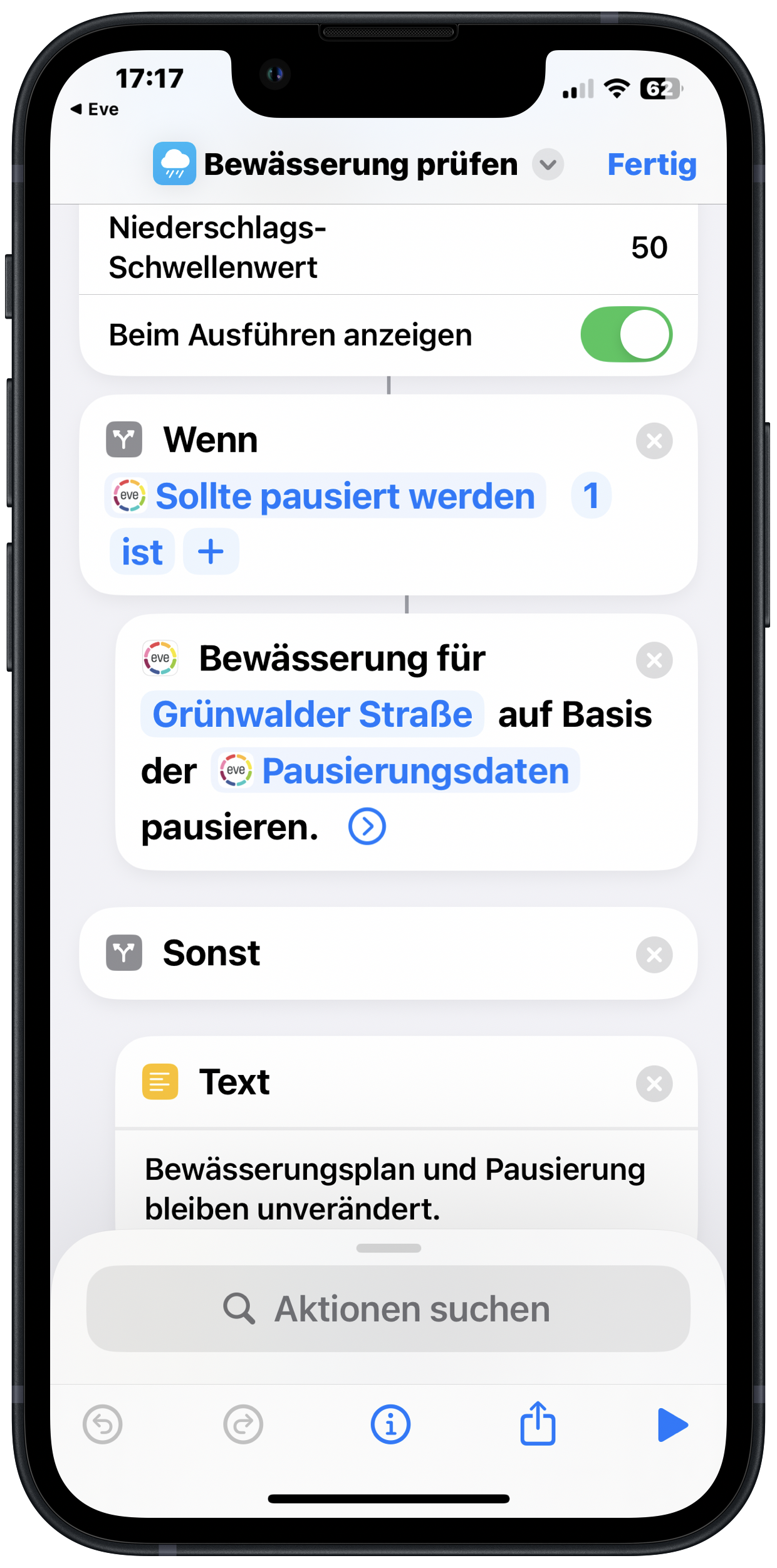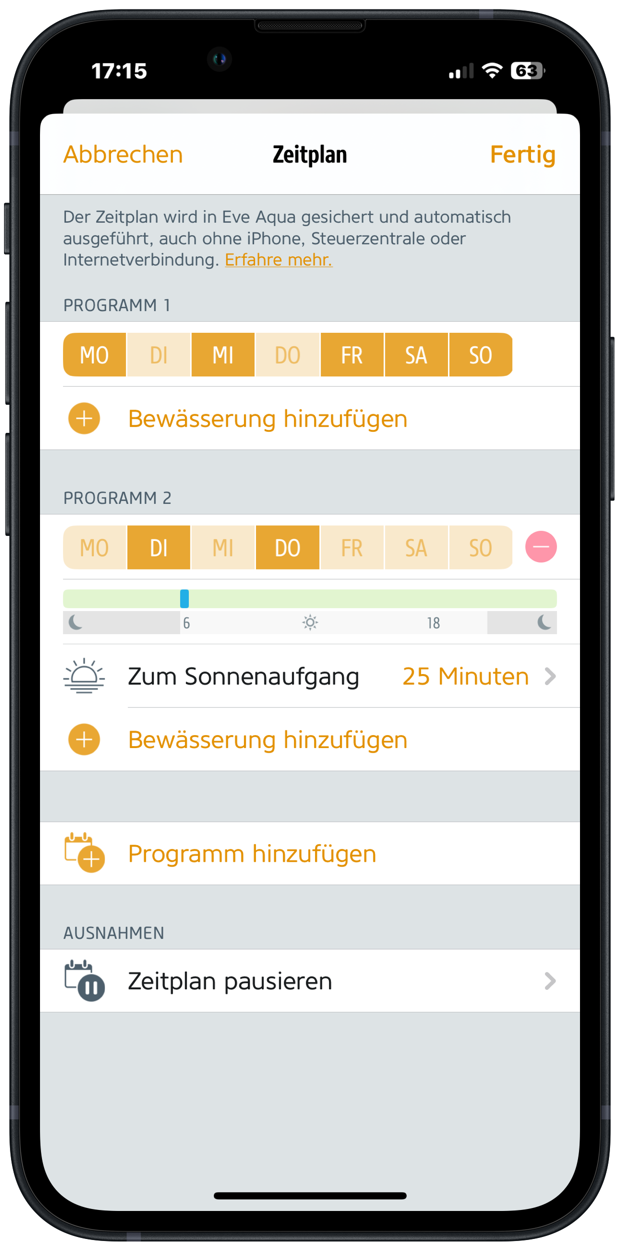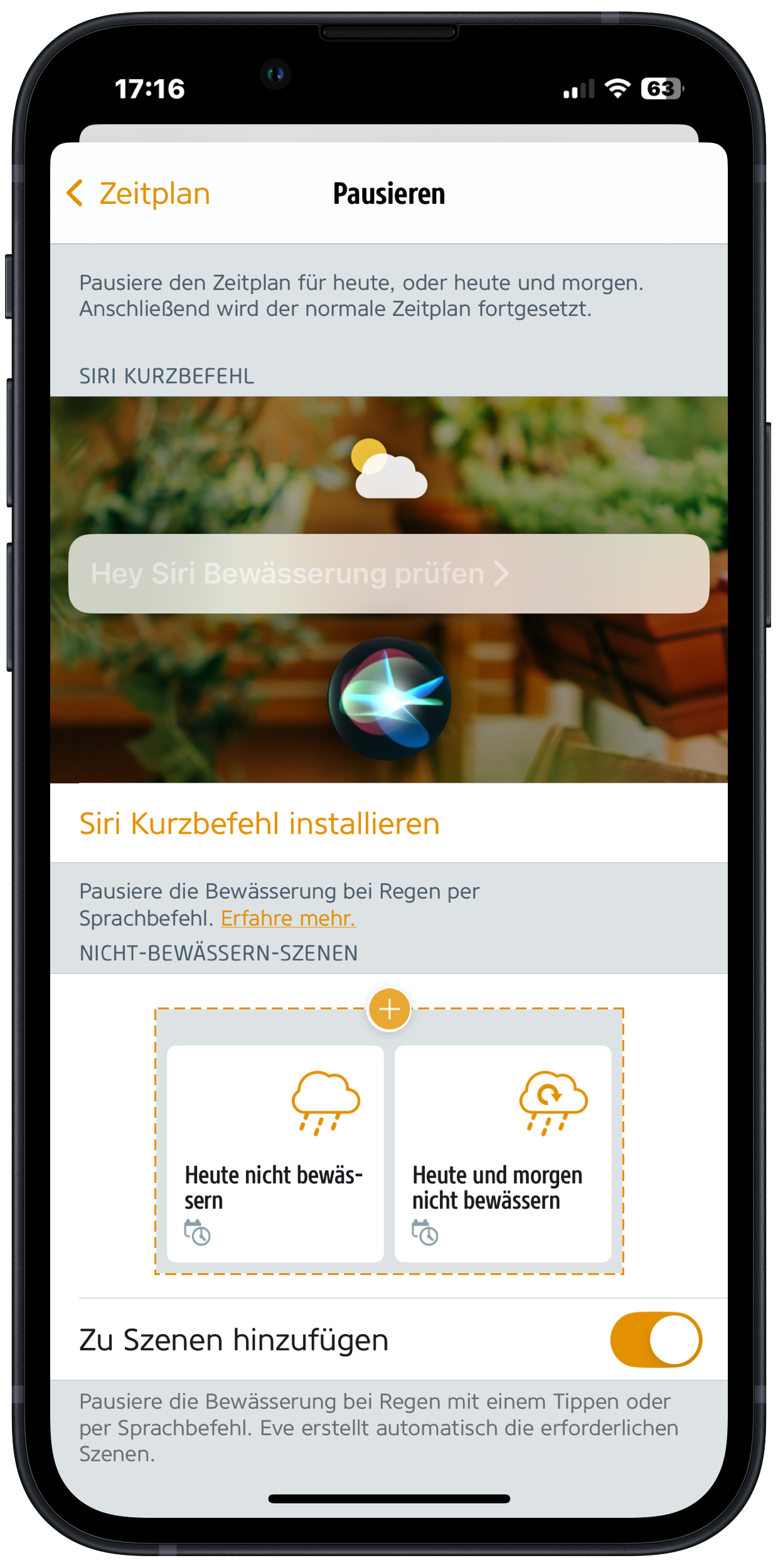 Tipp: Zusätzlich kannst du in der Eve-App Szenen erstellen lassen ("Heute nicht bewässern" / "Heute und morgen nicht bewässern"), die du auch ohne Berücksichtigung der Wettervorhersage manuell per Siri oder Tipp aktivieren kannst.