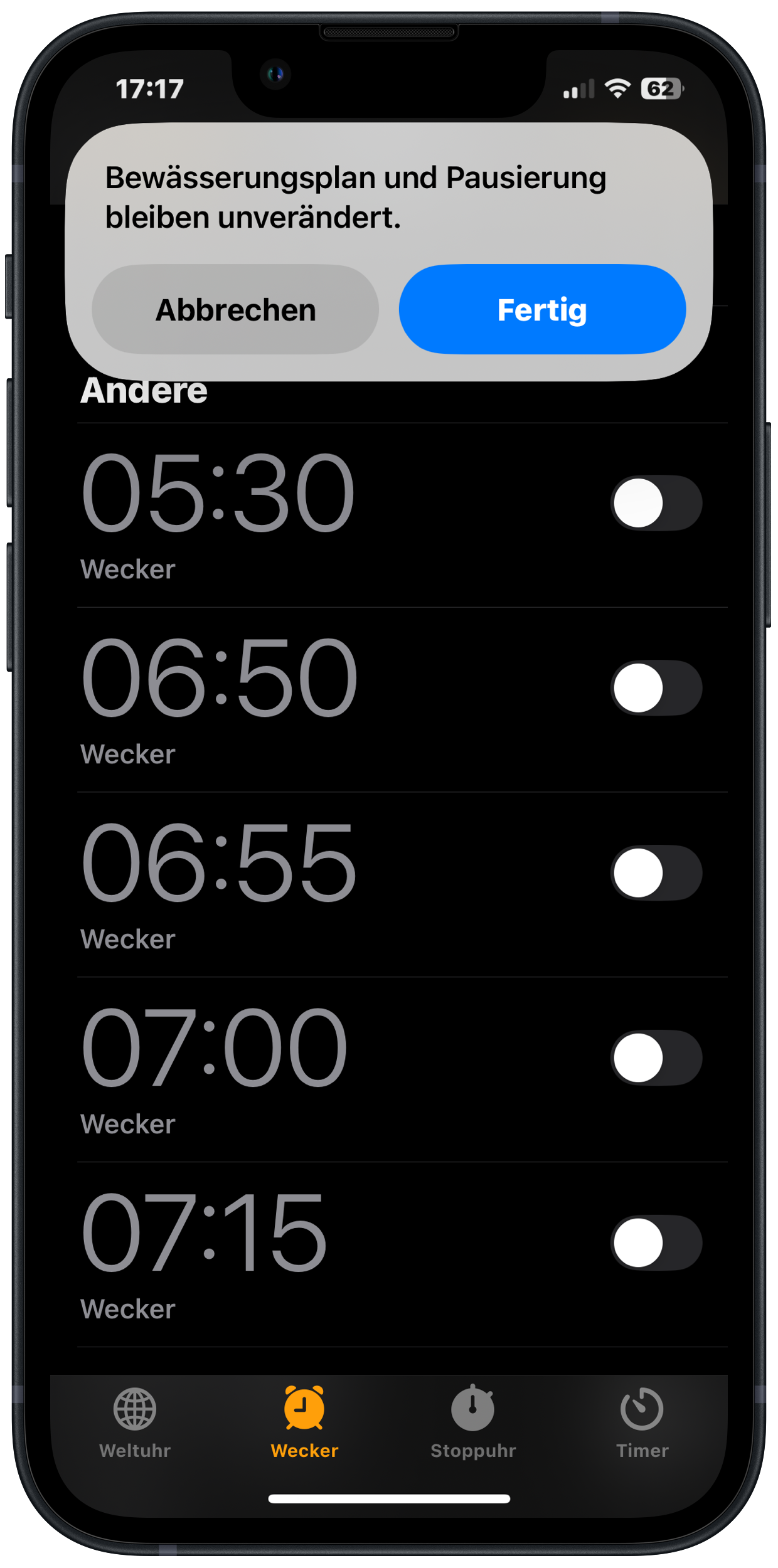 Tipp: Wählst du eine Uhrzeit vormittags, stellst du sicher, dass immer der tagesaktuelle Wetterbericht herangezogen wird und die Bewässerung auch nur an diesem Tag pausiert wird.