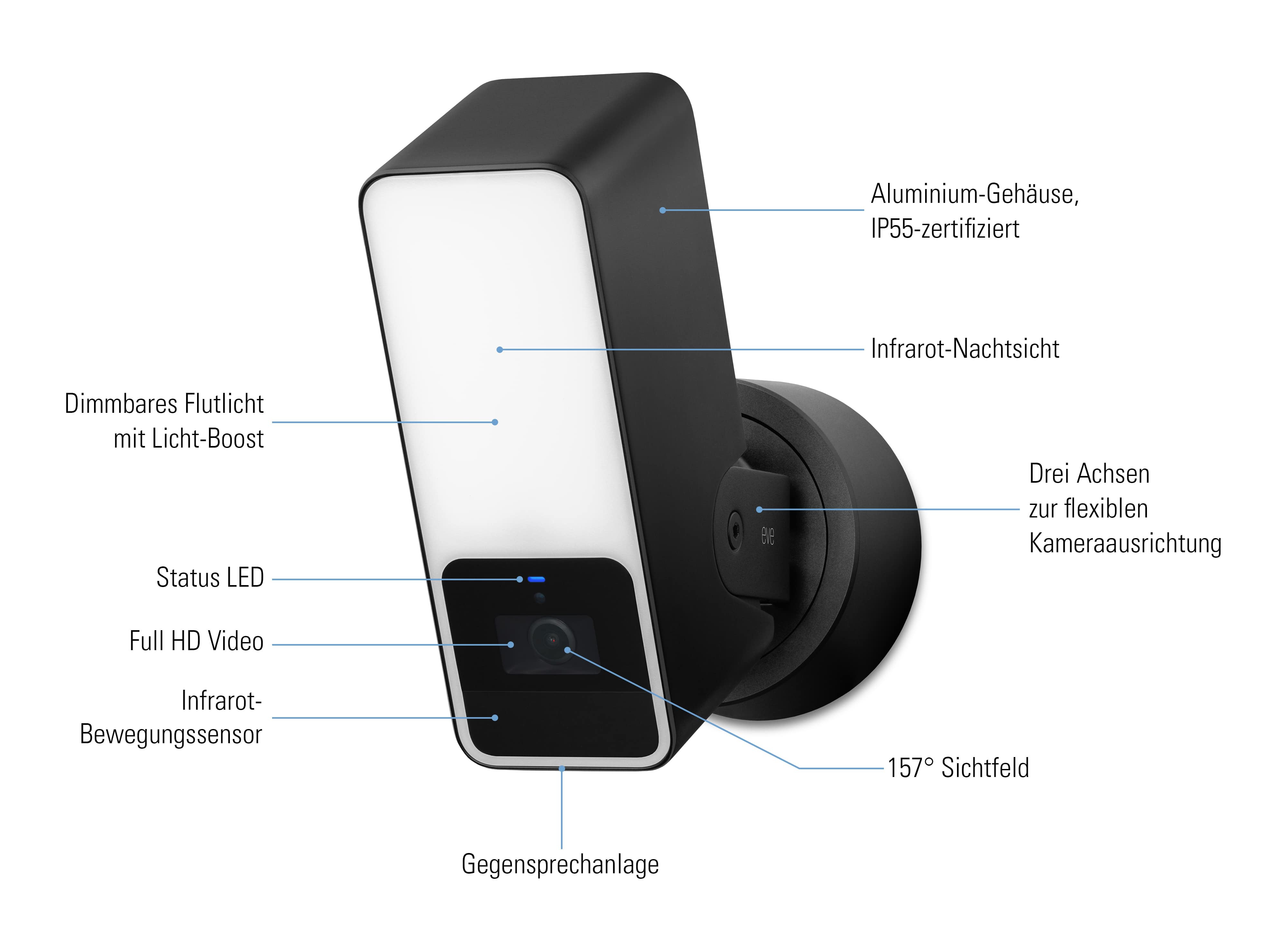 Durch das Design von Eve Outdoor Cam, das Kamera, Flutlicht und Bewegungssensor in einem Gehäuse vereint, ist die Ausrichtung besonders einfach. Egal, in welche Position du die Kamera drehst, neigst und schwenkst: die überwachten, ausgeleuchteten und aufgenommenen Bereiche sind immer in einer Linie.