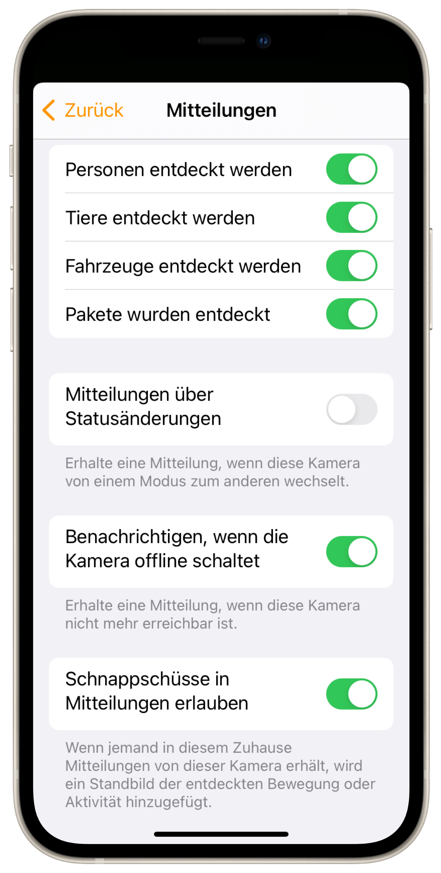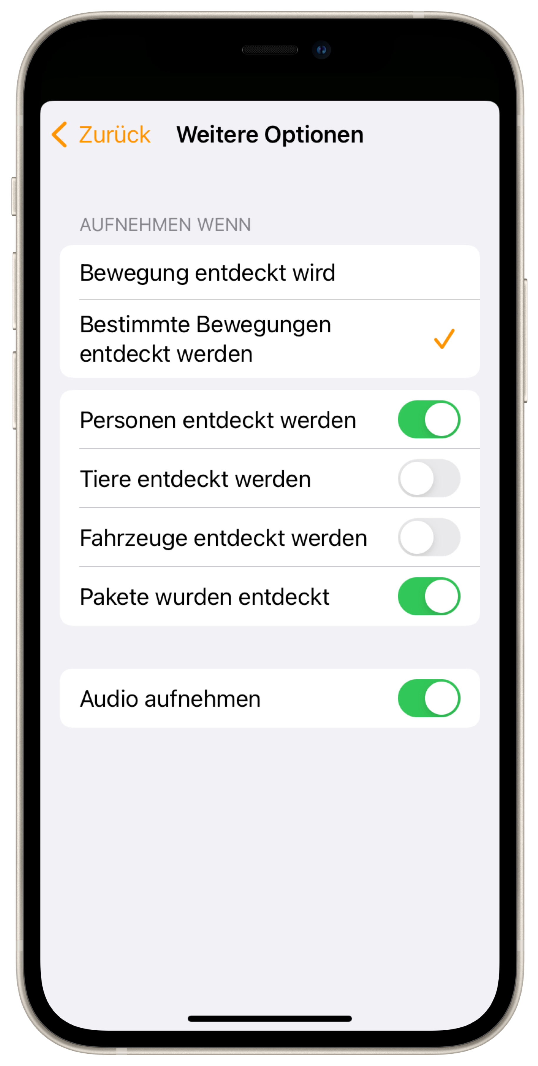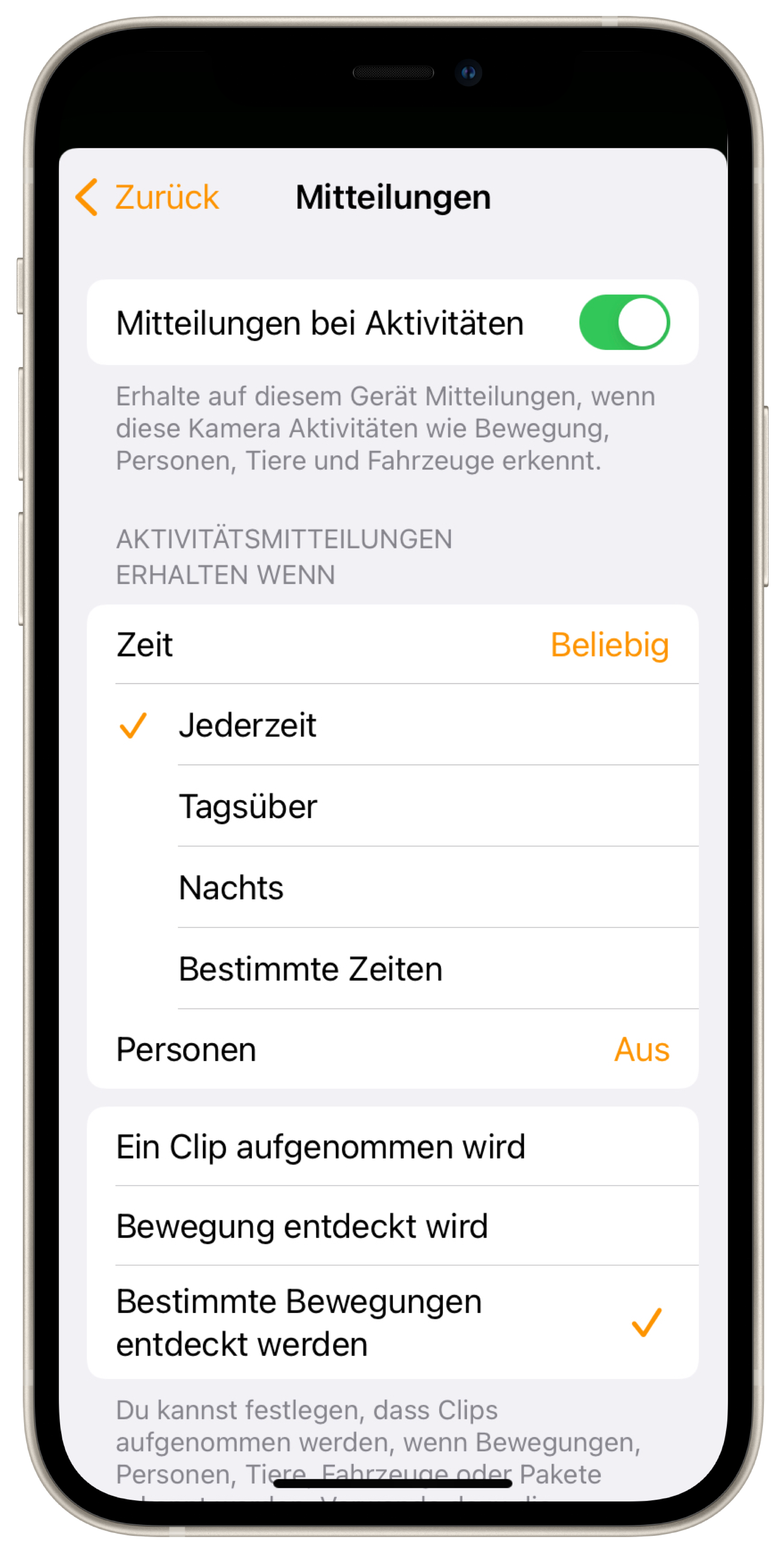 Streamen & Aufnahme erlauben: Die Kamera liefert einen Livestream und kann Aufnahmen erstellen - entweder bei jeder Bewegung, oder nur bei Menschen, Tieren, Paketen und/oder Fahrzeugen.