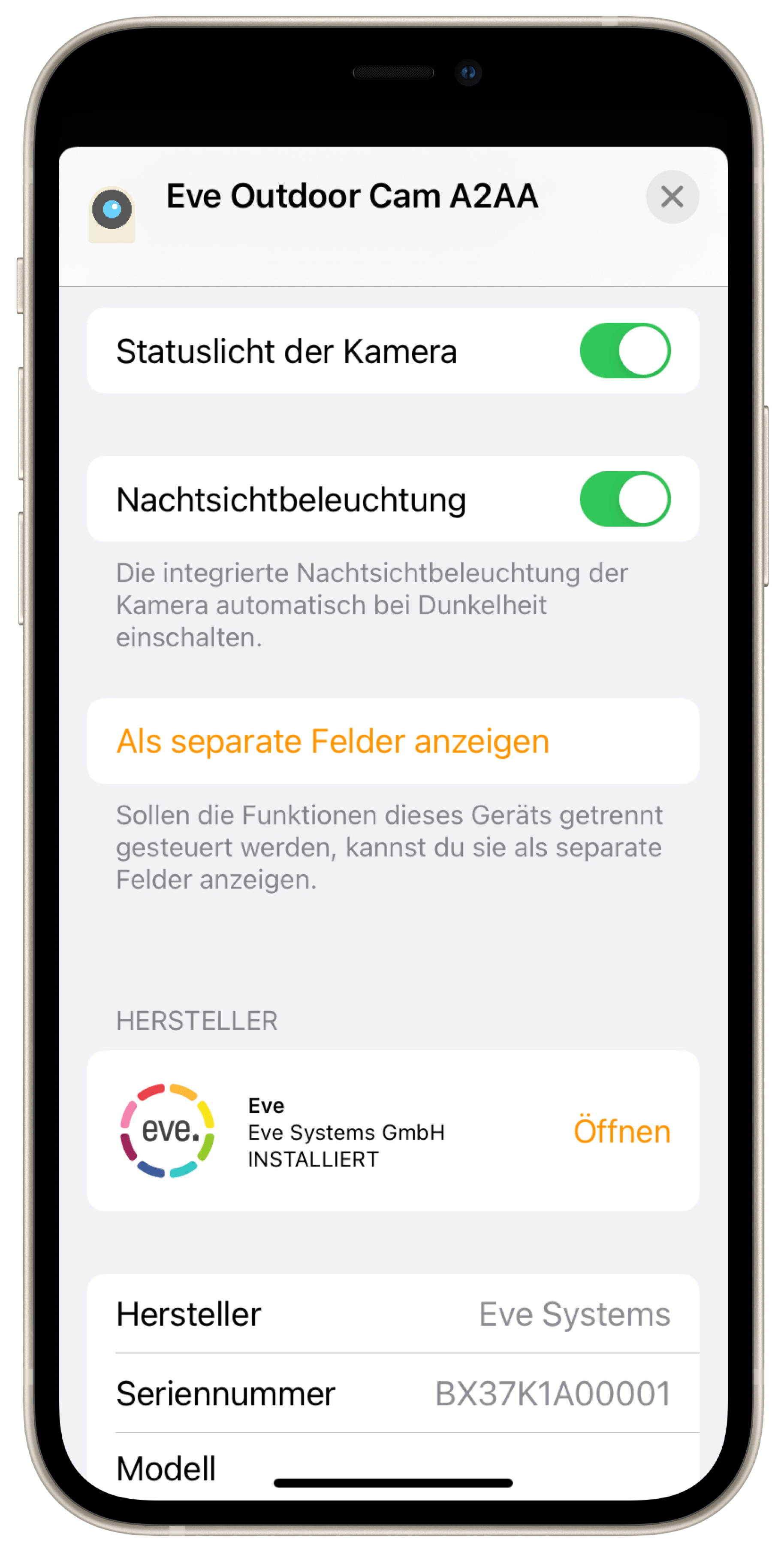 Während die Home-App die von HomeKit Secure Video bereit gestellten Funktionen verwaltet, glänzt die Eve-App in Verbindung mit Eve Outdoor Cam vor allem bei Zugriff und Steuerung der einzelnen Hardwarekomponenten, also Video, Flutlicht und Bewegungssensor.
