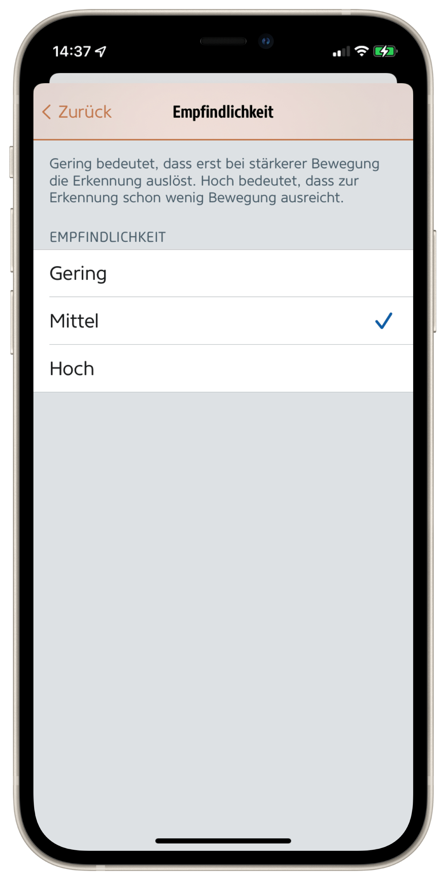 In Eve > Einstellungen > [Eve Outdoor Cam] passt du das Verhalten deiner Kamera deinen Anforderungen an. Wähle eine für den jeweiligen Einsatzort geeignete Empfindlichkeitsstufe für den Bewegungssensor aus und justiere gegebenenfalls nach einigen Tagen nach, falls bei relevanten Ereignissen Mitteilungen auszubleiben scheinen oder zu viel Unwichtiges gemeldet wird.