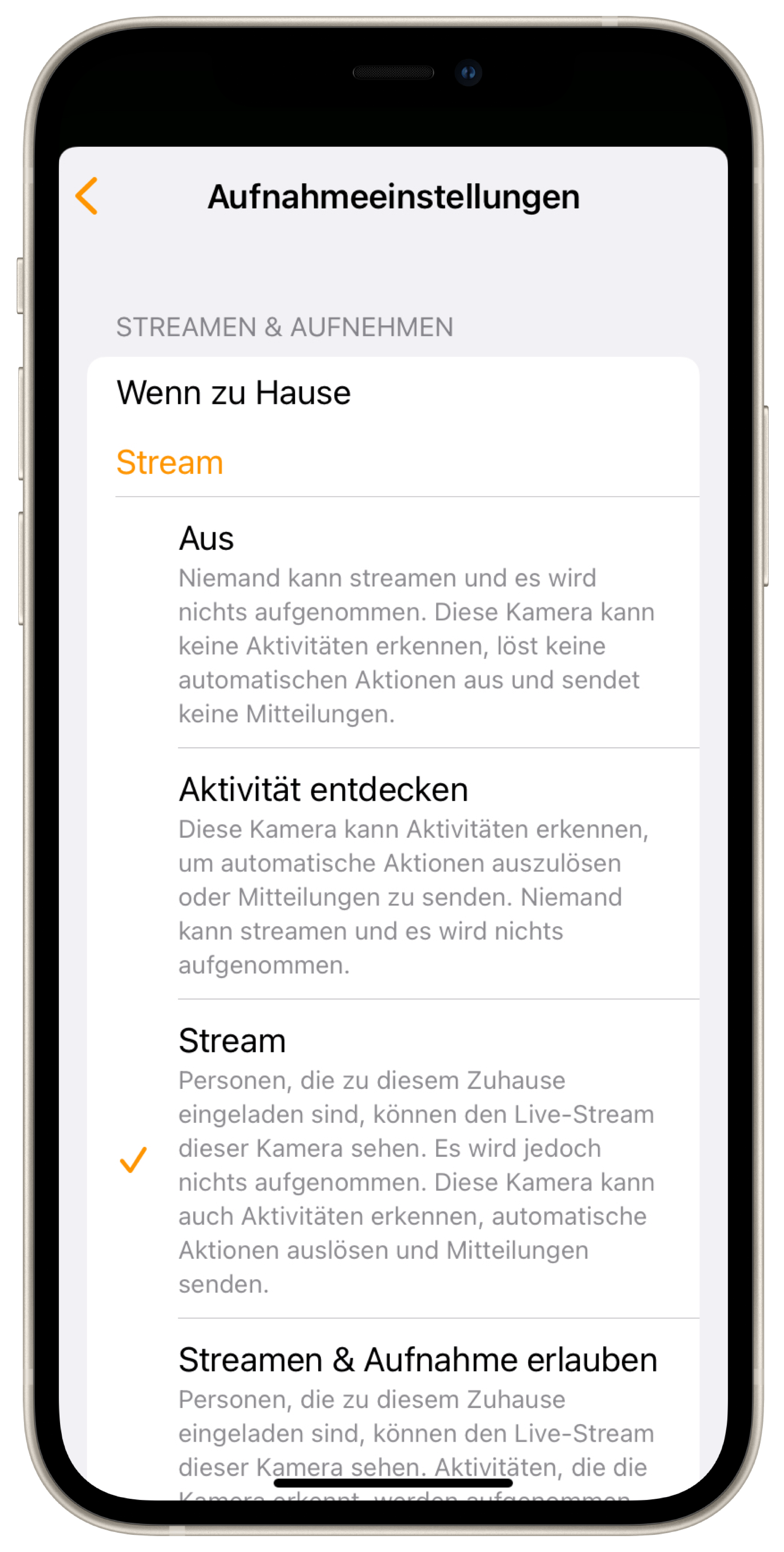 Stream: Neben Automationen und Mitteilungen bietet dieser Modus dir und eingeladenen Personen auch Zugriff auf den Livestream.